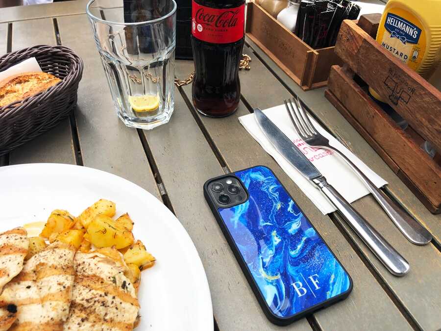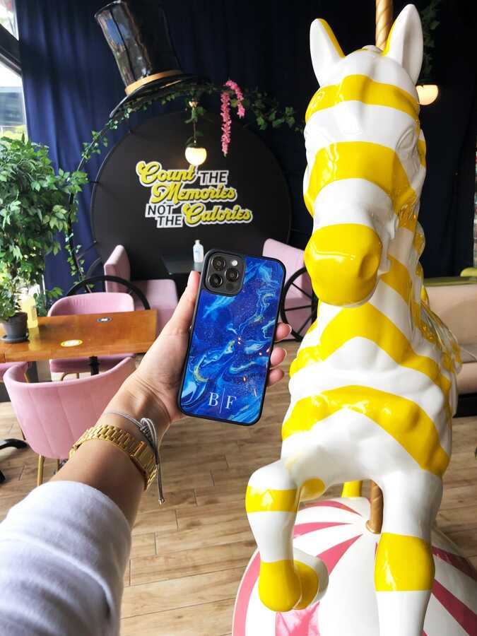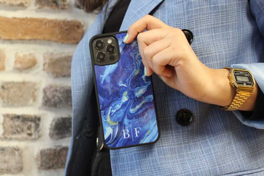 Dafoni Glossy iPhone 15 Kişiye Özel İki Harf Simli Mavi Mermer Kılıf